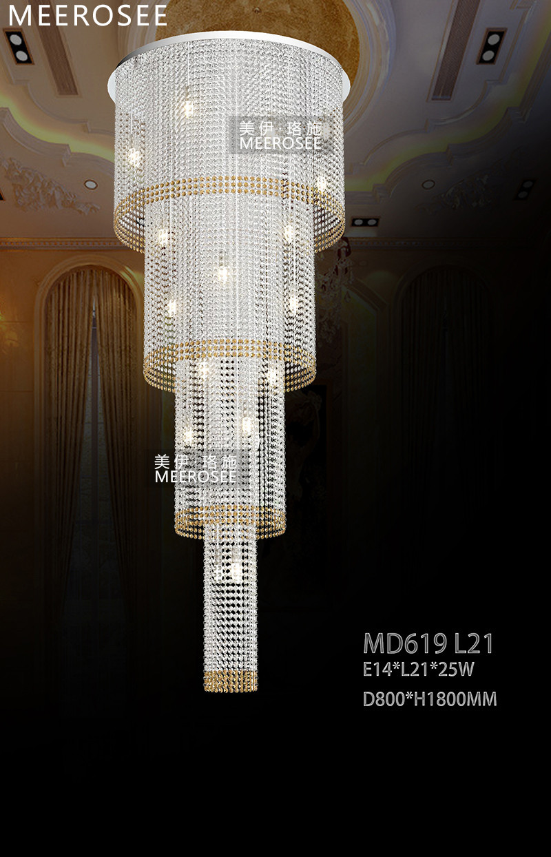 Free Shipping Classic Hotel Big Crystal Stair Lamp MD619 Model No. MD619 Materials: K9 Crystal, Stainless Steel, Metal Size: D800mm, H1800mm D1000mm,H1800mm Base Type: E14/E12 * L21 (Bulbs NOT Included) E14/E12 * L28 (Bulbs NOT Included) Color: Same as pic